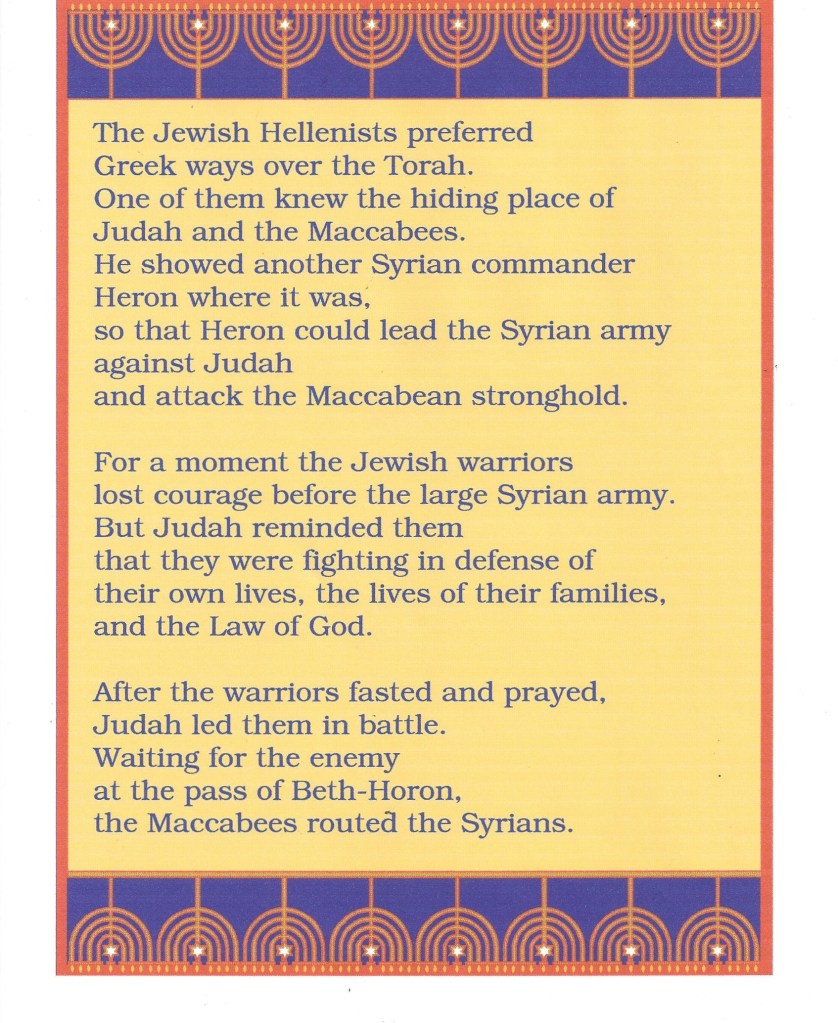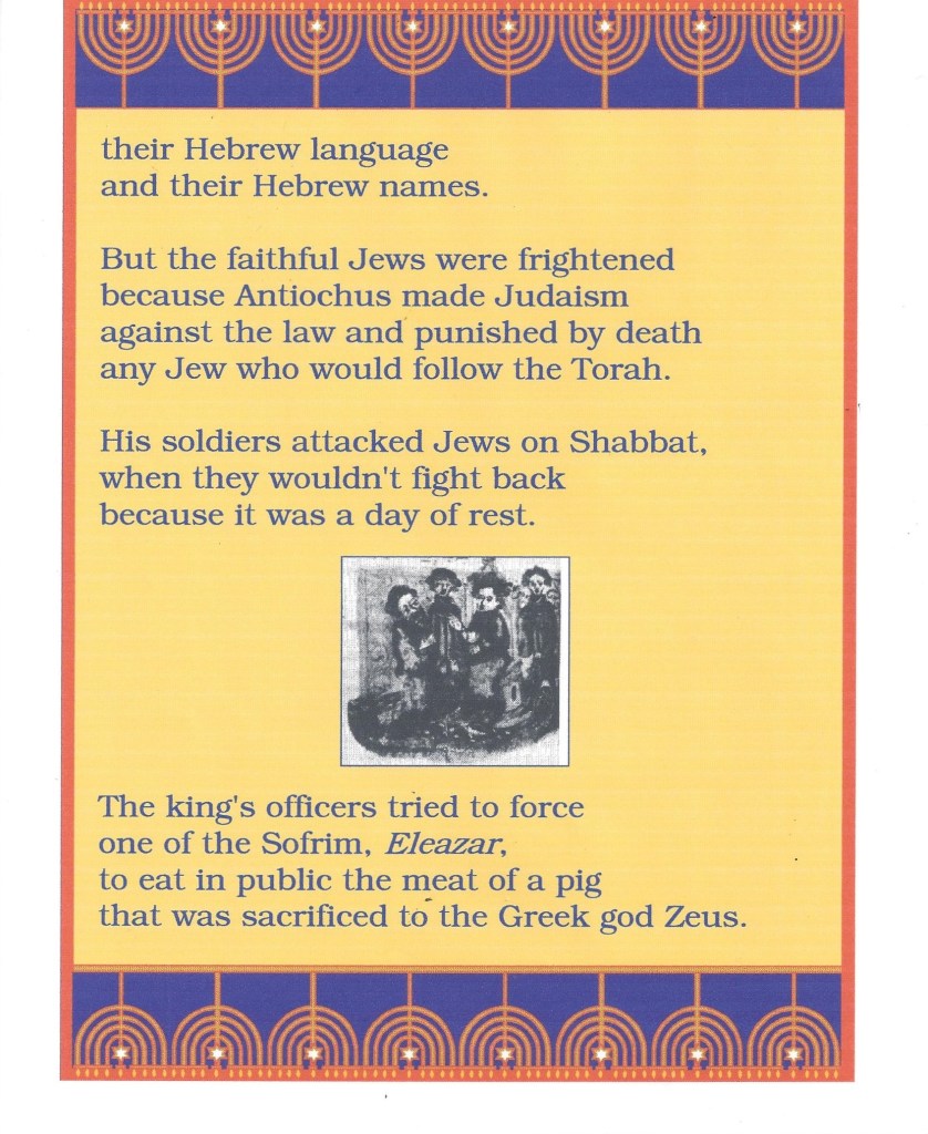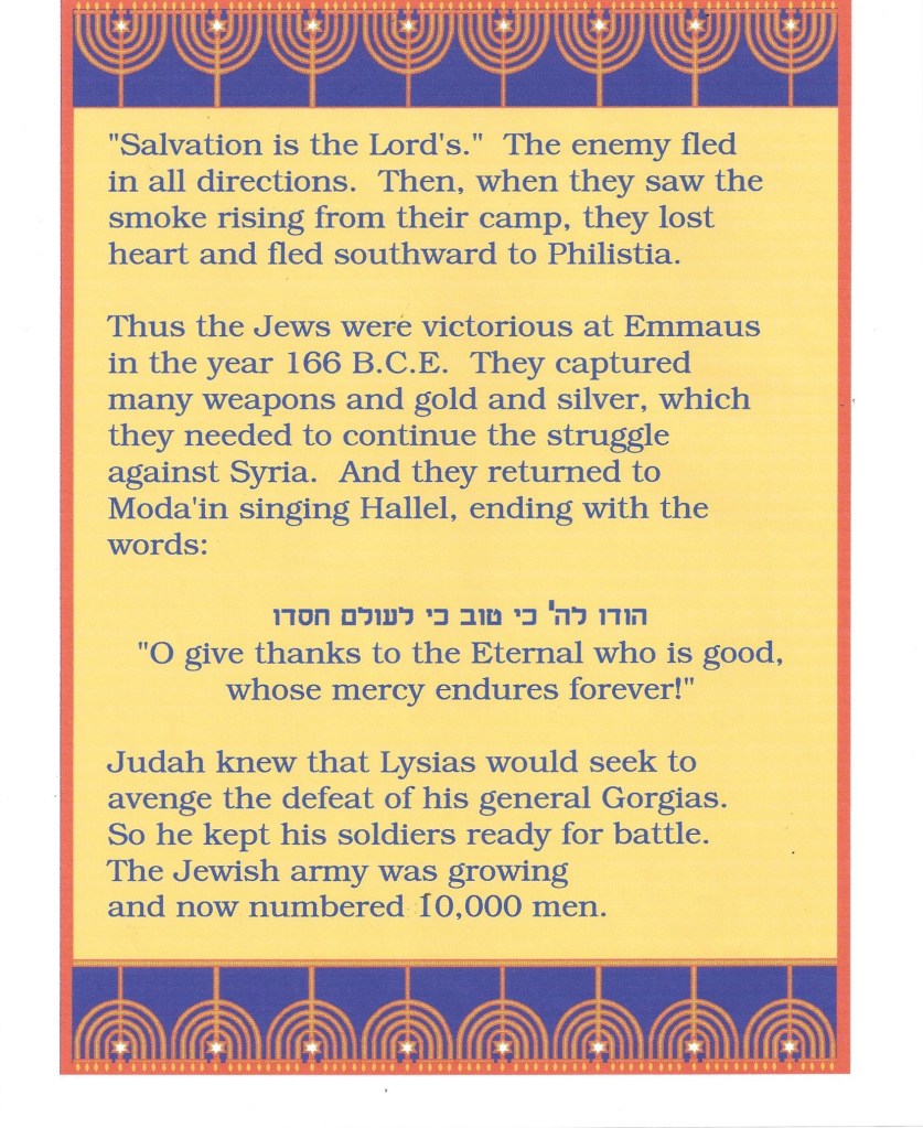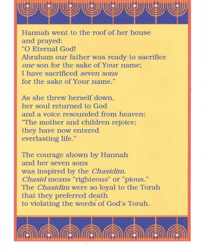 Although the practice of giving Chanukah Gelt (money) to children is thought to stem from the 17th century in Eastern Europe, today it is popular to associate it with Maccabean coinage which displayed the Menorah image. This coin has been identified with the Maccabean king John Hyrcanus, 135-104 B.C.E. The achievement of coinage is a sign of the independence of the sponsoring ruler. After the establishment of the State of Israel, the Bank of Israel issued a commemorative coin, depicting this image, to be used for Chanukah Gelt. The Hebrew root of the word chanukah is also used for the word chinukh, which means “education.” The first practice of Chanukah Gelt was to enable children to distribute the coins as honoraria to their teachers.