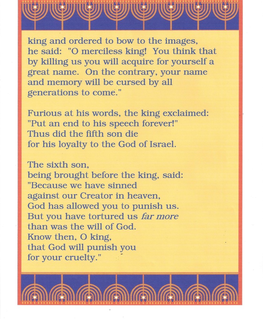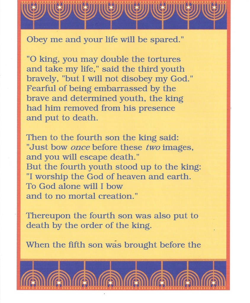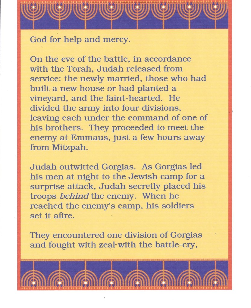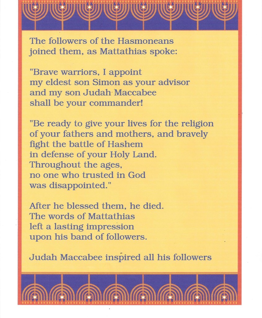 Although the practice of giving Chanukah Gelt (money) to children is thought to stem from the 17th century in Eastern Europe, today it is popular to associate it with Maccabean coinage which displayed the Menorah image. This coin has been identified with the Maccabean king John Hyrcanus, 135-104 B.C.E. The achievement of coinage is a sign of the independence of the sponsoring ruler. After the establishment of the State of Israel, the Bank of Israel issued a commemorative coin, depicting this image, to be used for Chanukah Gelt. The Hebrew root of the word chanukah is also used for the word chinukh, which means “education.” The first practice of Chanukah Gelt was to enable children to distribute the coins as honoraria to their teachers.